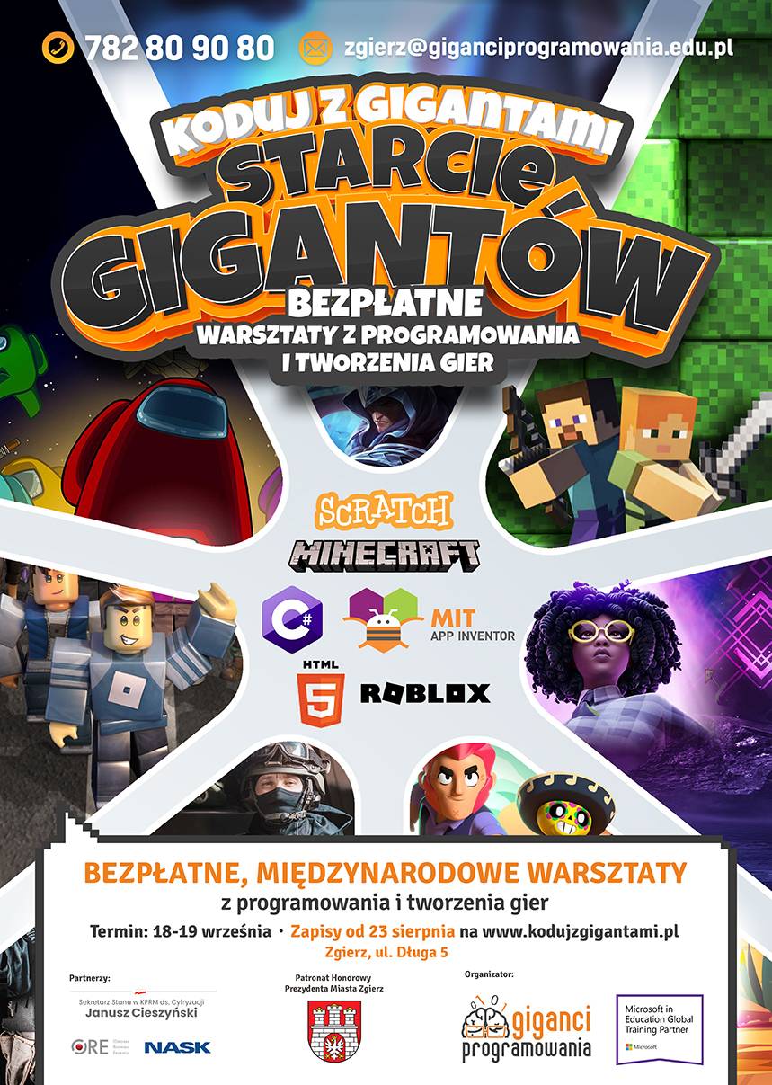 Wystartowały zapisy do kolejnej edycji akcji "Koduj z Gigantami". Zajęcia odbywają się stacjonarnie w 90 miastach Polski oraz online w Polsce i za granicą. Akcja prowadzona będzie stacjonarnie także w Zgierzu (ul. Długa 5), w dniach 18-19.09.