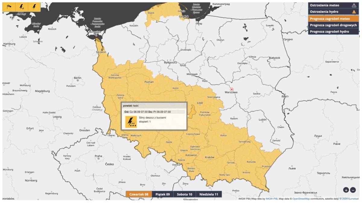 W związku z załamaniem pogody synoptycy Instytutu Meteorologii i Gospodarki Wodnej planuje wydać ostrzeżenia meteorologiczne przed niebezpiecznymi zjawiskami. W czwartek alerty pierwszego stopnia przed burzami mogą objąć praktycznie sporą część Polski co prezentuje poniższa mapa. Ostrzeżenie pierwszego stopnia ma obowiązywać od czwartku od godziny 7.30 rano do piątku do 7.30.