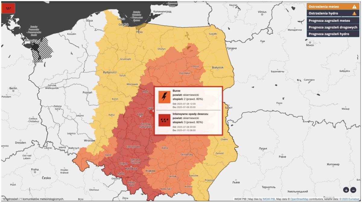W nadchodzących dniach województwo łódzkie znajdzie się pod wpływem wyjątkowo niesprzyjających warunków atmosferycznych. Instytut Meteorologii i Gospodarki Wodnej – Państwowy Instytut Badawczy (IMGW-PIB) wydał ostrzeżenia meteorologiczne dla wszystkich powiatów regionu, obejmujące zarówno gwałtowne burze, jak i intensywne, długotrwałe opady deszczu. Synoptycy ostrzegają, że sytuacja pogodowa może stanowić zagrożenie dla zdrowia i mienia mieszkańców.