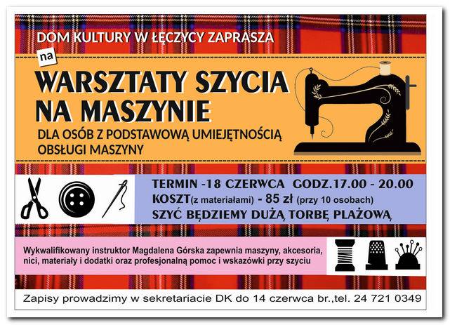 Warsztaty odbędą się 18 czerwca w godzinach 17:00 - 20:00. Koszt (z materiałami) wynosi 85 złotych (przy 10 osobach). Podczas warsztatów uczestnicy będą szyć duża torbę plażową. Zapisy i więcej informacji w sekretariacie Domku Kultury lub pod numerem telefonu: 24 721 03 49 do 14 czerwca .