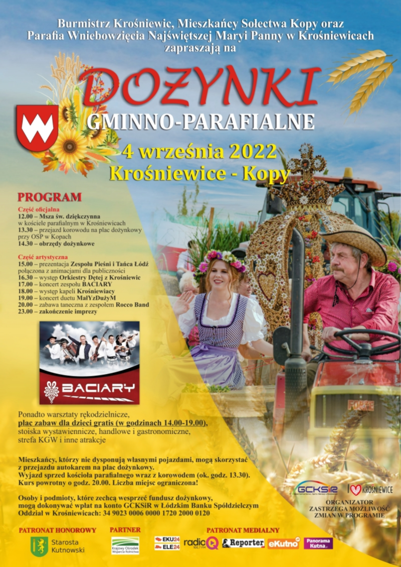 Burmistrz Krośniewic, Mieszkańcy Sołectwa Kopy oraz Parafia Wniebowzięcia Najświętszej Maryi Panny w Krośniewicach zapraszają na Dożynki Gminno-Parafialne.