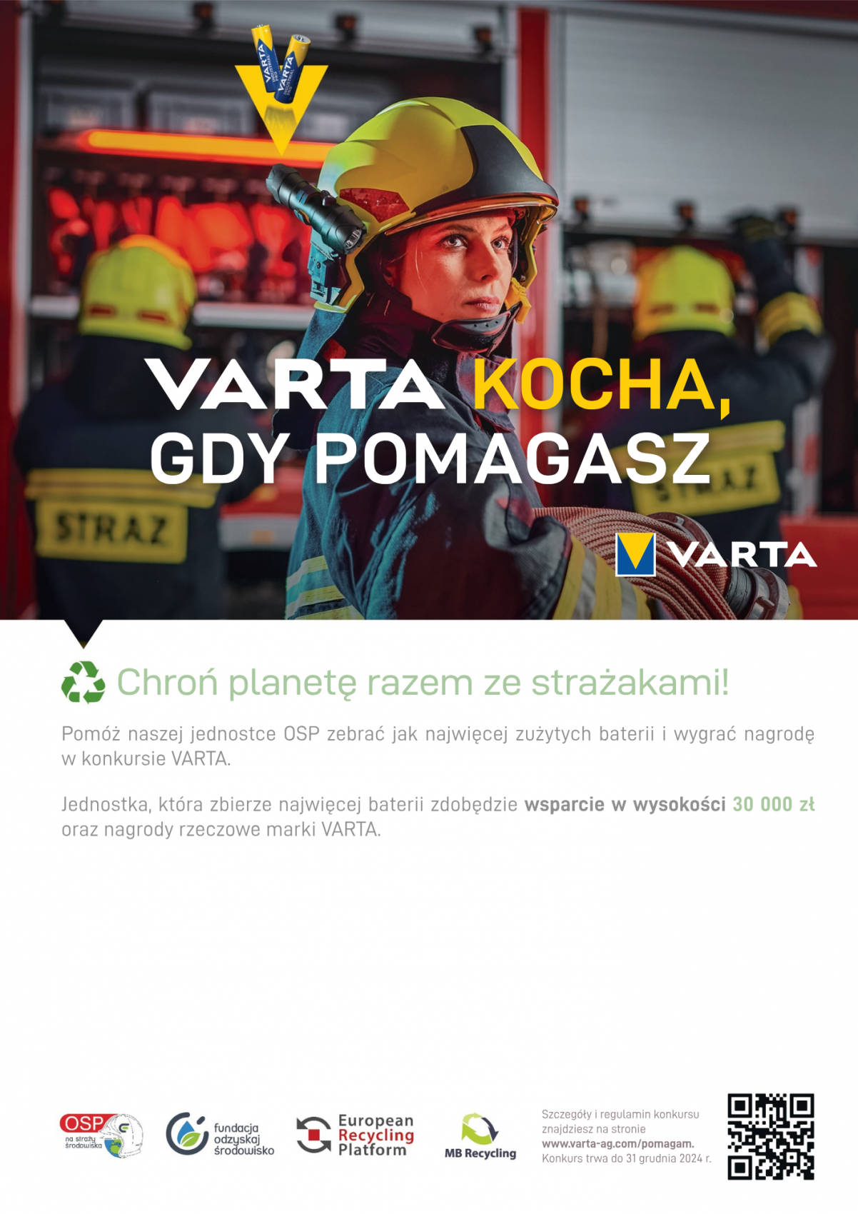 Ochotnicza Straż Pożarna w Mazewie, działająca w projekcie "OSP na straży środowiska", ogłasza udział w konkursie "Varta Kocha, Gdy Pomagasz". Tym samym zachęca do włączenia się w zbiórkę zużytych baterii.