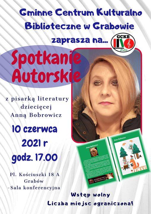 10 czerwca w Gminnym Centrum Kulturalno Bibliotecznym w Grabowie odbędzie się spotkanie autorskie z pisarką Anną Bobrowicz.