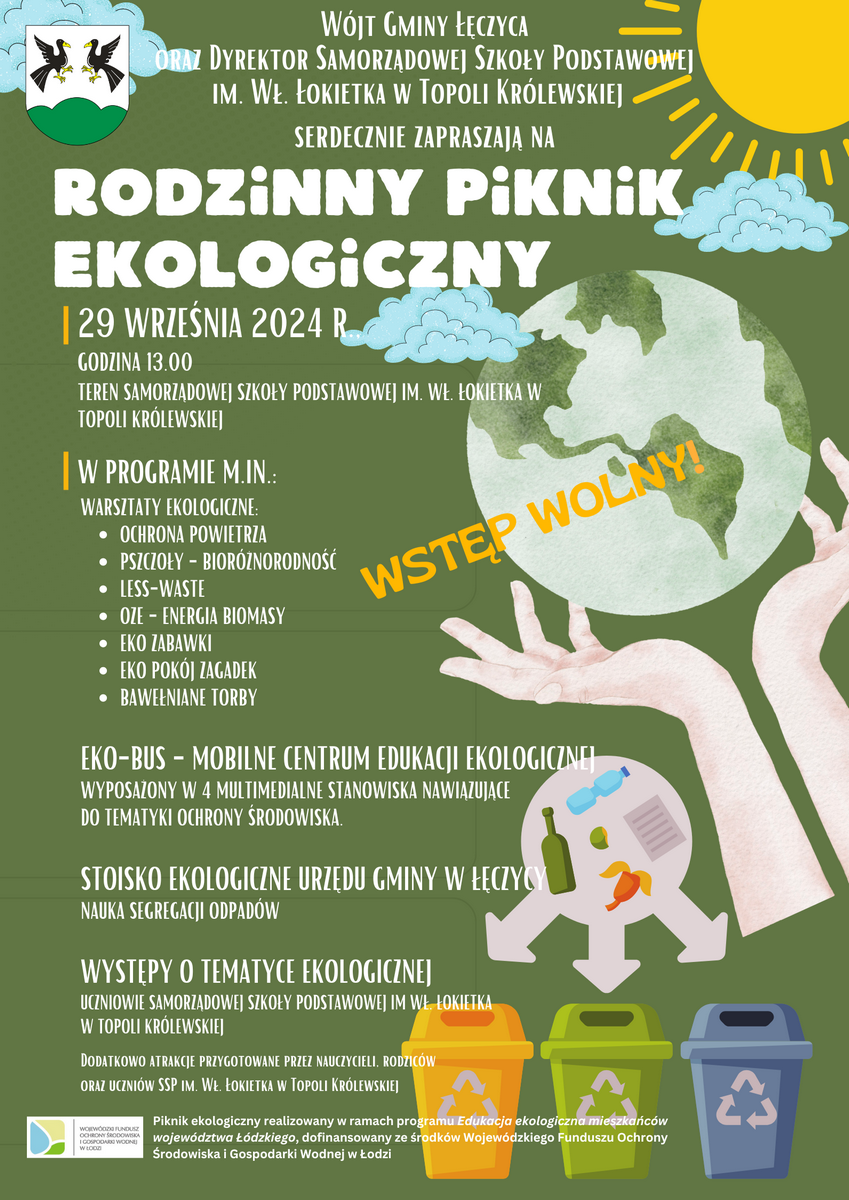 Wójt Gminy Łęczyca oraz Dyrektor Samorządowej Szkoły Podstawowej im. Wł. Łokietka w Topoli Królewskiej zapraszają na Rodzinny Piknik Ekologiczny.