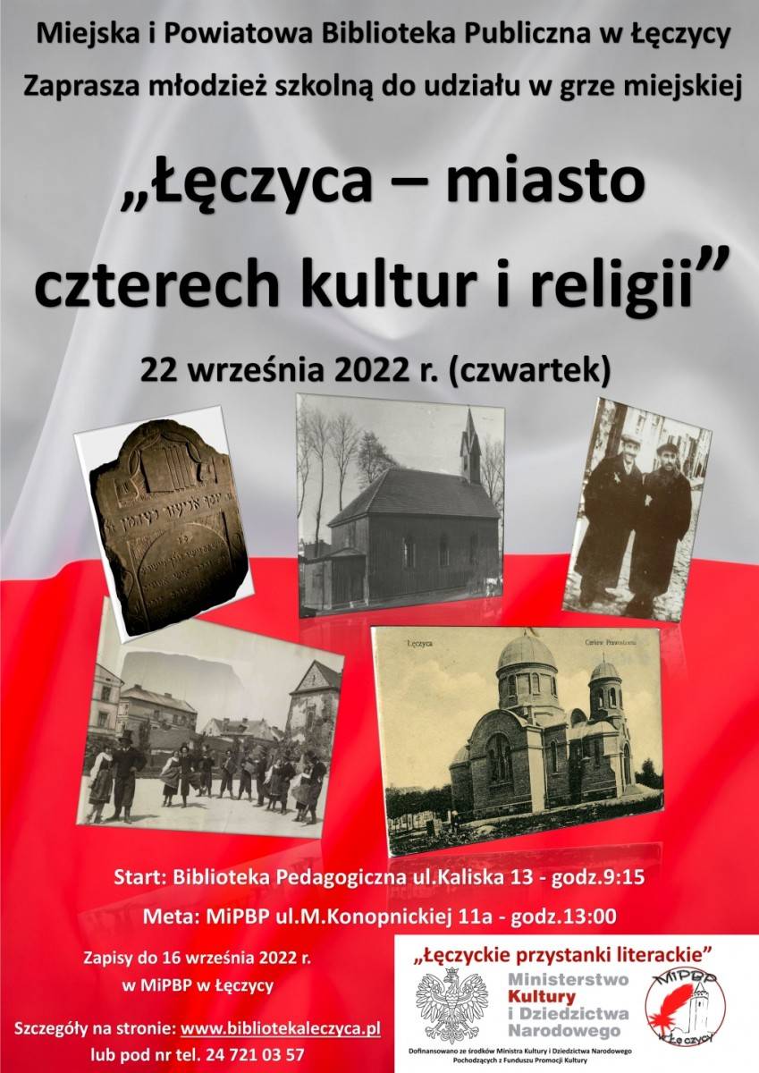 Miejska i Powiatowa Biblioteka Publiczna w Łęczycy zaprasza młodzież szkolną do udziału w grze miejskiej „Łęczyca – miasto czterech kultur i religii" 22 września 2022 r. (czwartek)