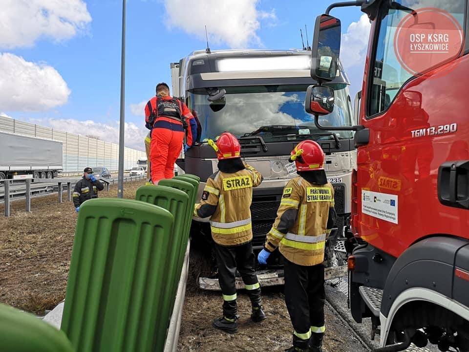 - Kierowca jadący pojazdem ciężarowym doznał ataku padaczki, przez co jadąc pasem w stronę Poznania uderzył w bariery energochłonne, przebił je a następnie zatrzymał się na pasie zieleni w stronę Warszawy - relacjonują druhowie z OSP Łyszkowice.