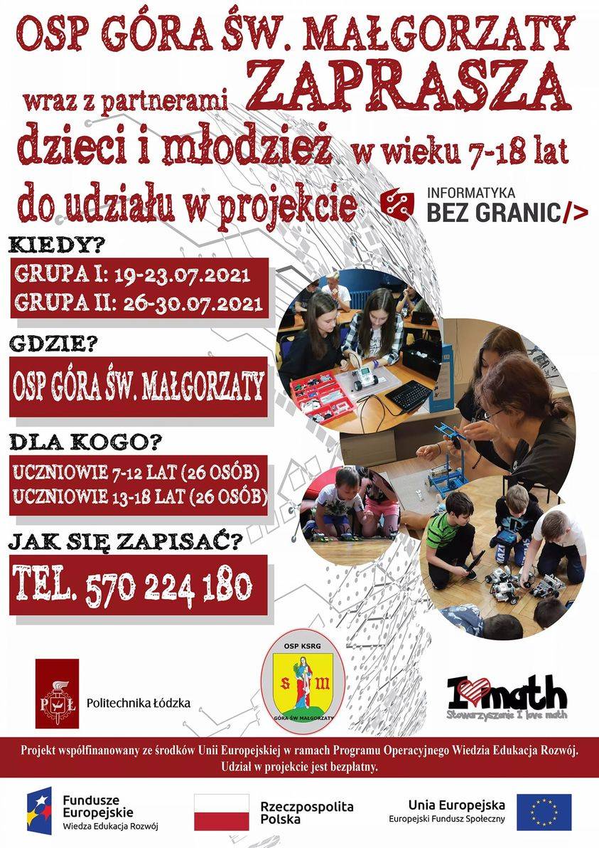 Ochotnicza Straż Pożarna w Górze Św. Małgorzaty, wraz z partnerami, zaprasza dzieci i młodzież w wieku 7-18 lat do udziału w projekcie Informatyka bez granic.