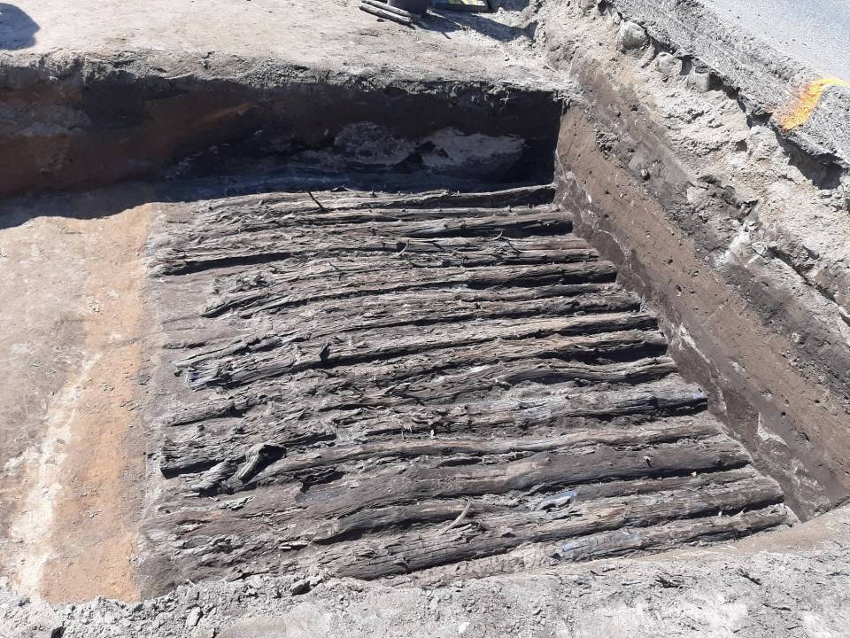 - W jednym z wykopów, tuż przy szosie, natrafiono na fragment starej drogi, biegnącej prawdopodobnie w kierunku niegdysiejszej bramy poznańskiej na północnych rogatkach Łęczycy. Starą drogę tworzą ułożone ciasno obok siebie bale drewniane - informują przedstawiciele Muzeum w Łęczycy.