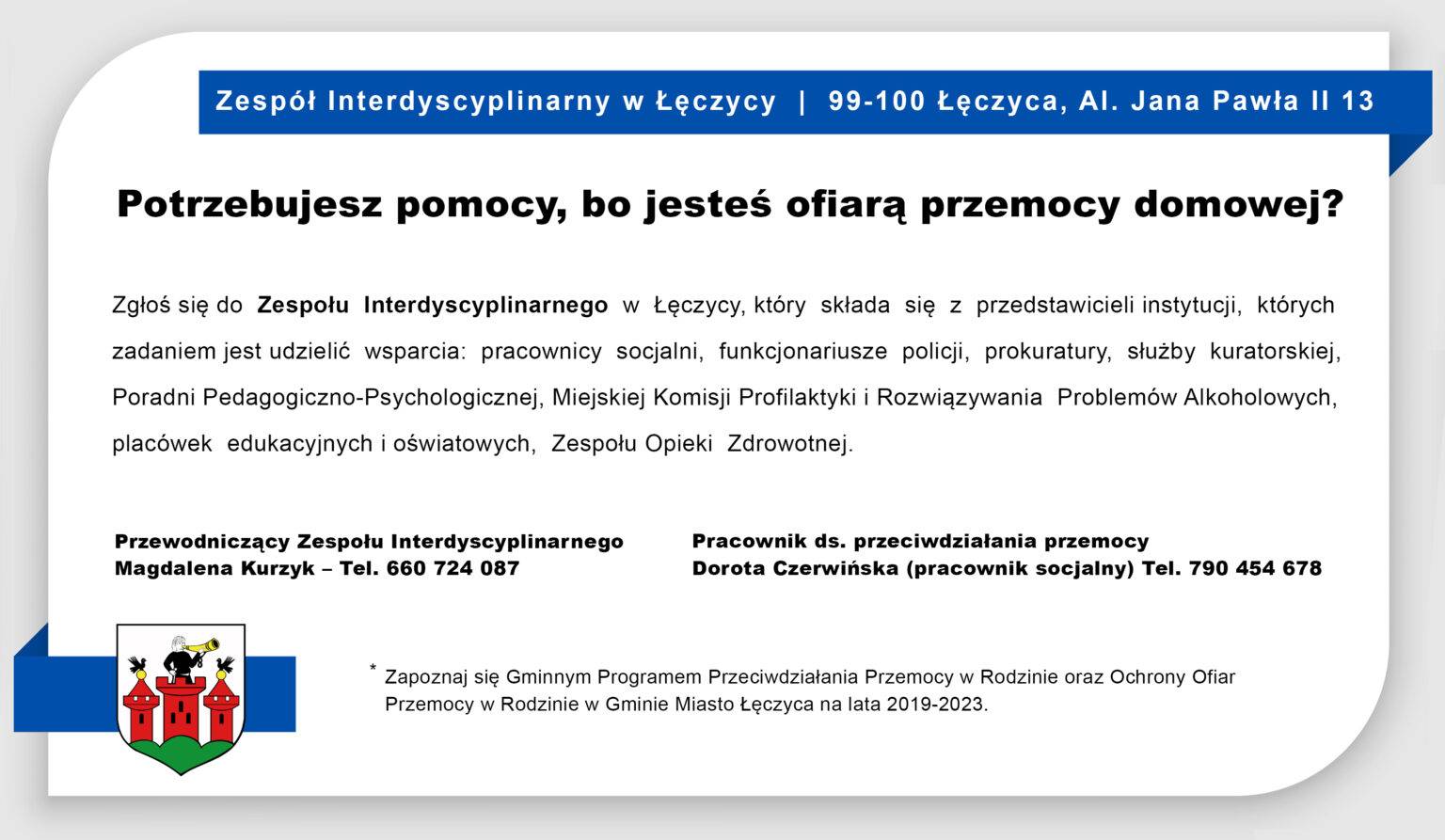 Zgłoś się do Zespołu Interdyscyplinarnego w Łęczycy, który składa się z przedstawicieli wielu instytucji, a ich zadaniem jest udzielić wsparcia: pracownicy socjalni, funkcjonariusze policji, prokuratury, służby kuratorskiej, Poradni Pedagogiczno-Psychologicznej, Miejskiej Komisji Profilaktyki i Rozwiązywania Problemów Alkoholowych, placówek edukacyjnych i oświatowych, Zespołu Opieki Zdrowotnej. Poniżej więcej informacji oraz kontakt do przedstawicieli Zespołu.