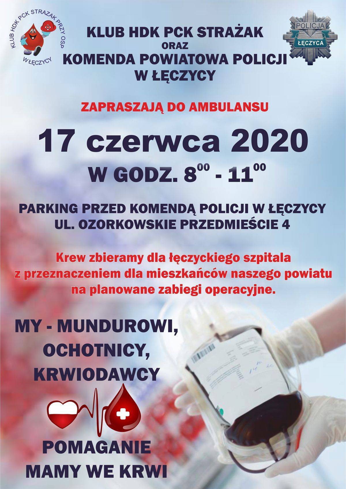 Policjanci z łęczyckiej komendy oraz przedstawiciele klubu HDK PCK „Strażak" przy OSP w Łęczycy zapraszają 17 czerwca 2020 roku do ambulansu RCKiK z Łodzi, który po raz kolejny zaparkuje przed budynkiem łęczyckiej policji.