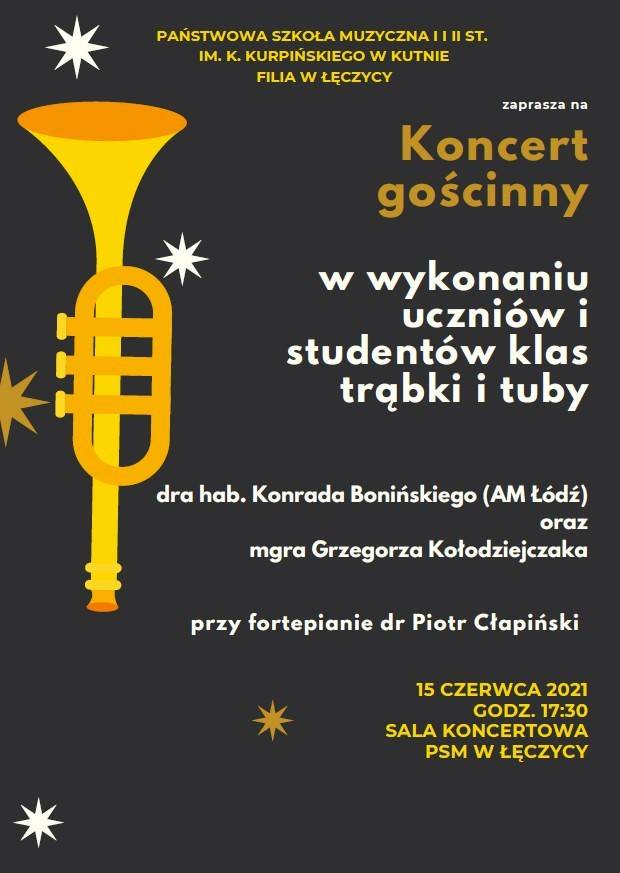 Państwowa Szkoła Muzyczna I i II st. im. K. Kurpińskiego w Kutnie, Filia w Łęczycy zaprasza na Koncert gościnny w wykonaniu uczniów o studentów klas trąbki i tuby dr hab. Konrada Bonińskiego (AM Łódź) oraz mgr Grzegorza Kołodziejczaka. Przy fortepianie zasiądzie dr Piotr Cłapiński.