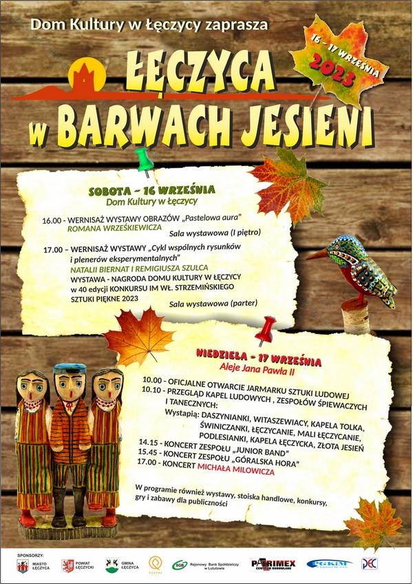 „Łęczyca w Barwach Jesieni" rozpocznie się już w sobotę (16 września) o godzinie 16:00 wernisażem wystawy obrazów „Pastelowa aura" autorstwa Romana Wrześkiewicza. O godzinie 17:00 odbędzie się wernisaż wystawy „Cykl wspólnych rysunków i plenerów eksperymentalnych" Natalii Biernat i Remigiusza Szulca. Obie wystawy będzie można oglądać w budynku Domu Kultury,