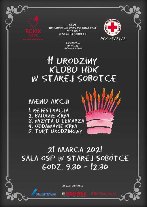 Klub Honorowych Dawców Krwi PCK przy OSP w Starej Sobótce zaprasza na akcję oddawania krwi, która odbędzie się z okazji 11 urodzin Klubu HDK w Starej Sobótce.