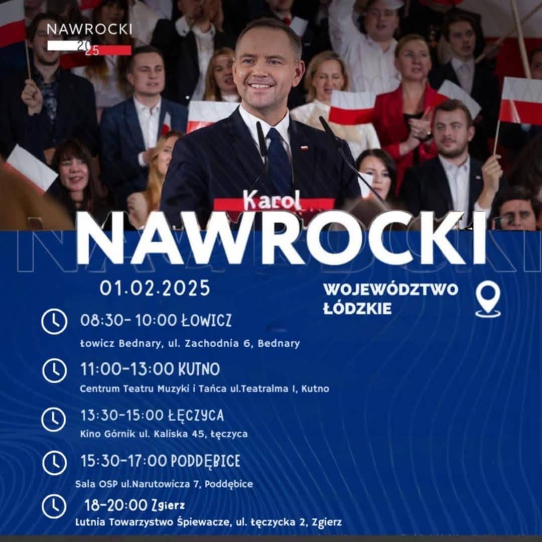 Cykl rozpocznie się o godzinie 8:30 w Bednarach w powiecie łowickim. Następnie Nawrocki uda się do Centrum Teatru Muzyki i Tańca w Kutnie, skąd pojedzie do Kina Górnik w Łęczycy (13:30). Kolejne spotkanie zostało zaplanowane na godzinę 15:30 i odbędzie się w sali OSP Poddębice. Dzień zakończy w Zgierzu, gdzie wizyta planowana jest na godzinę 18:00.