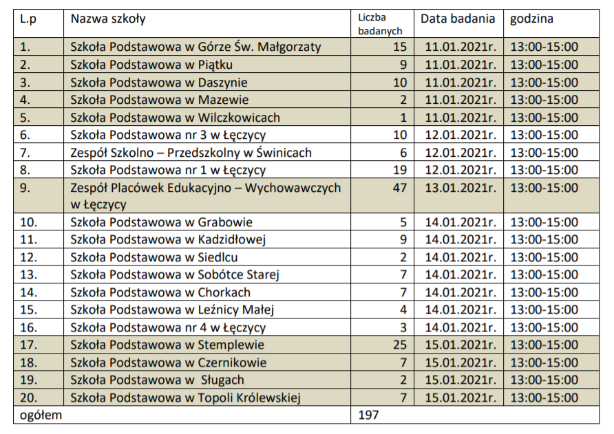 Państwowy Powiatowy Inspektor Sanitarny w Łęczycy podał harmonogram badań nauczycieli i personelu pomocniczego klas I-III szkół podstawowych oraz szkół specjalnych, w kierunku koronawirusa SARS-CoV-2.