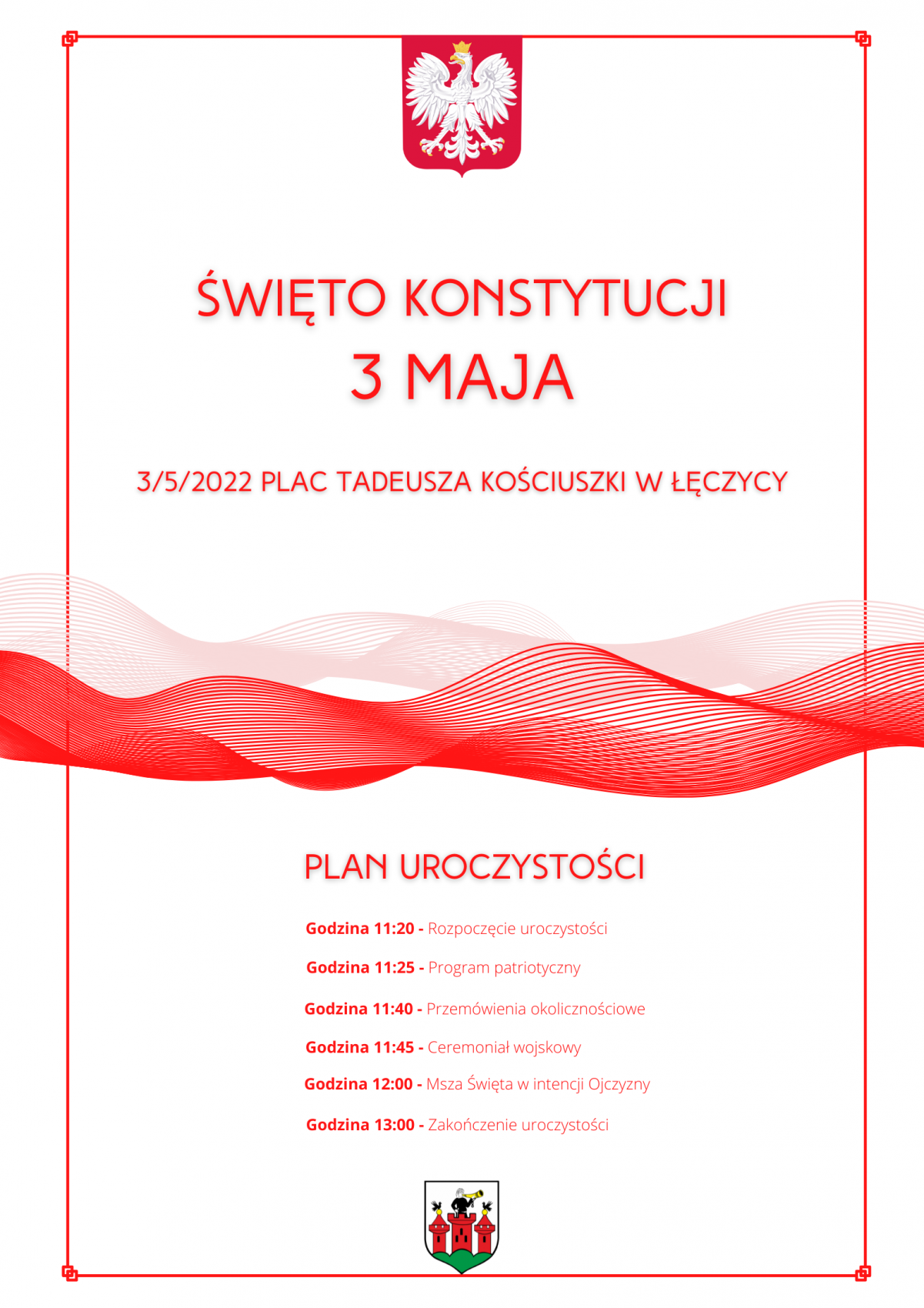 Urząd Miejski w Łęczycy zaprasza do udziału w obchodach Święta Konstytucji, które odbędą się we wtorek (3 maja) na Placu Tadeusza Kościuszki.