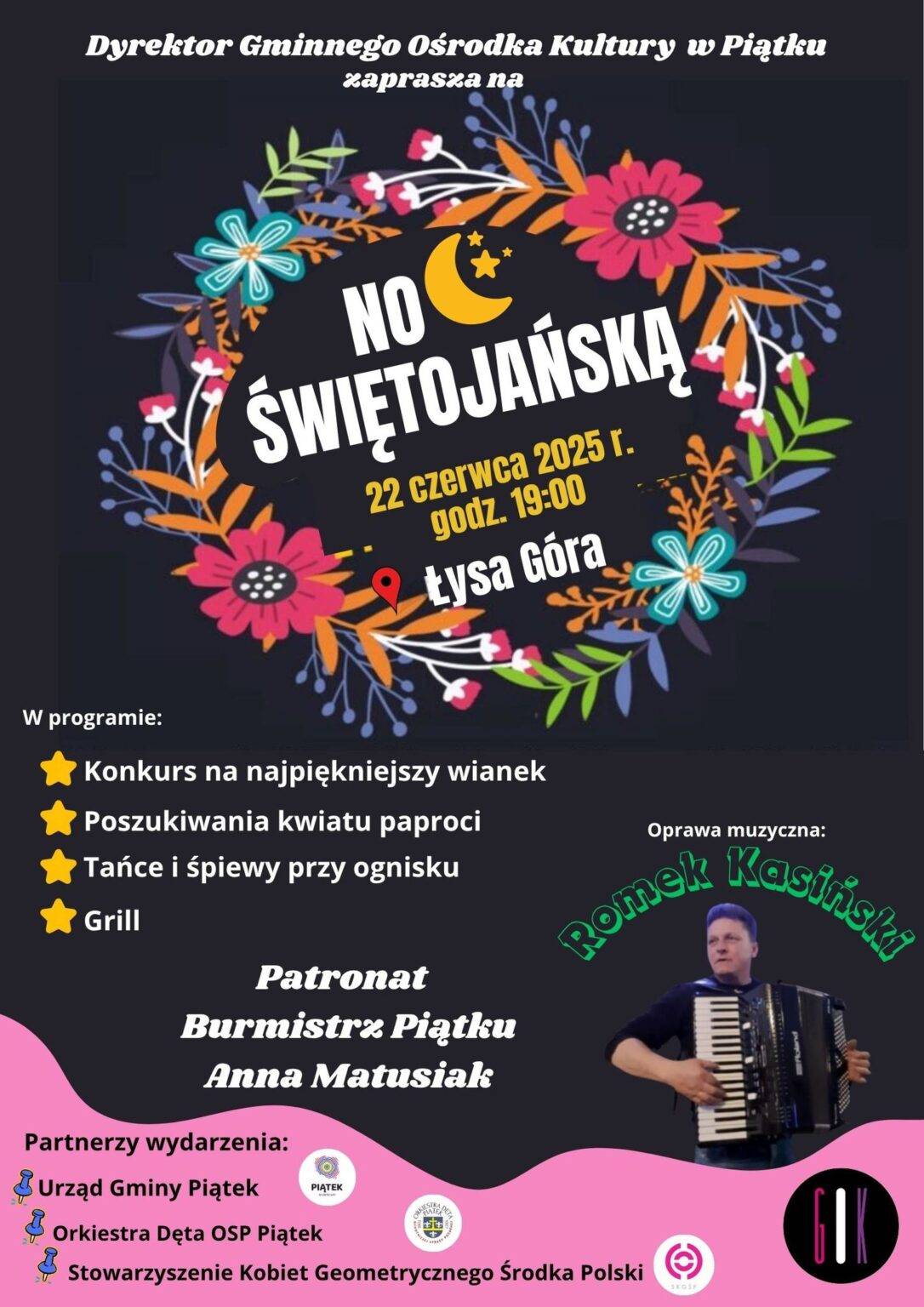 O oprawę muzyczną zadba Romek Kasiński, którego występ zapewni wyjątkowy klimat całej imprezy. Noc Świętojańska odbywa się pod patronatem Burmistrz Piątku, Anny Matusiak, a partnerami wydarzenia są: Urząd Miejski w Piątku, Orkiestra OSP Piątek oraz Stowarzyszenie Kobiet Geometrycznego Środka Polski.