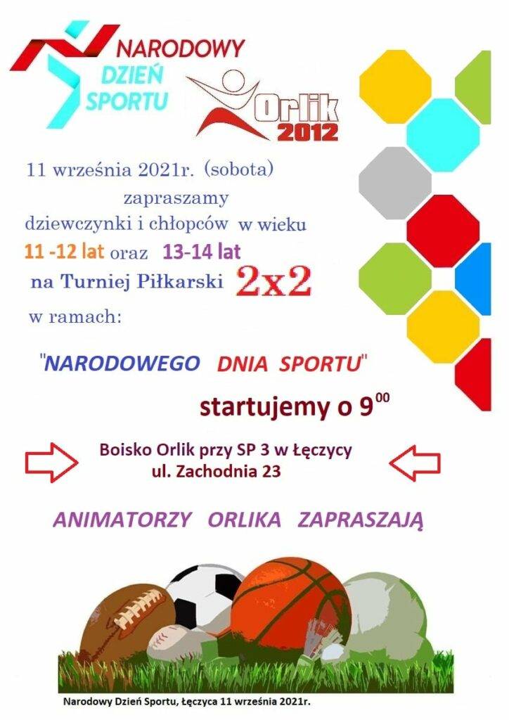 Animatorzy Orlika przy Szkole Podstawowej Nr 3 w Łęczycy zapraszają dziewczynki i chłopców w wieku 11-12 lat oraz 13-14 lat do wzięcia udziału w Turnieju Piłkarskim 2×2 w ramach Narodowego Dnia Sportu, który odbędzie się 11 września 2021 roku (sobota) o godzinie 9.00.