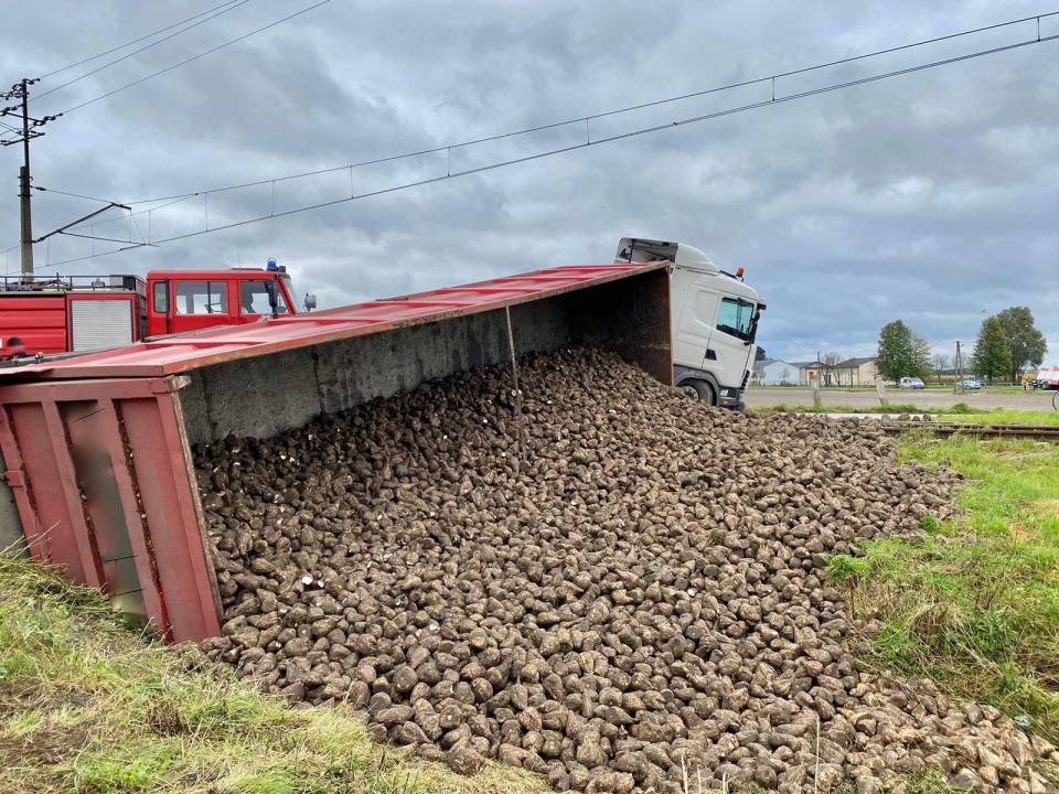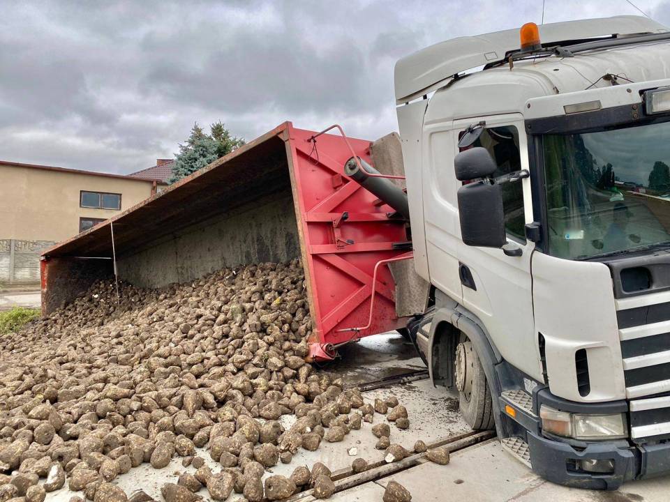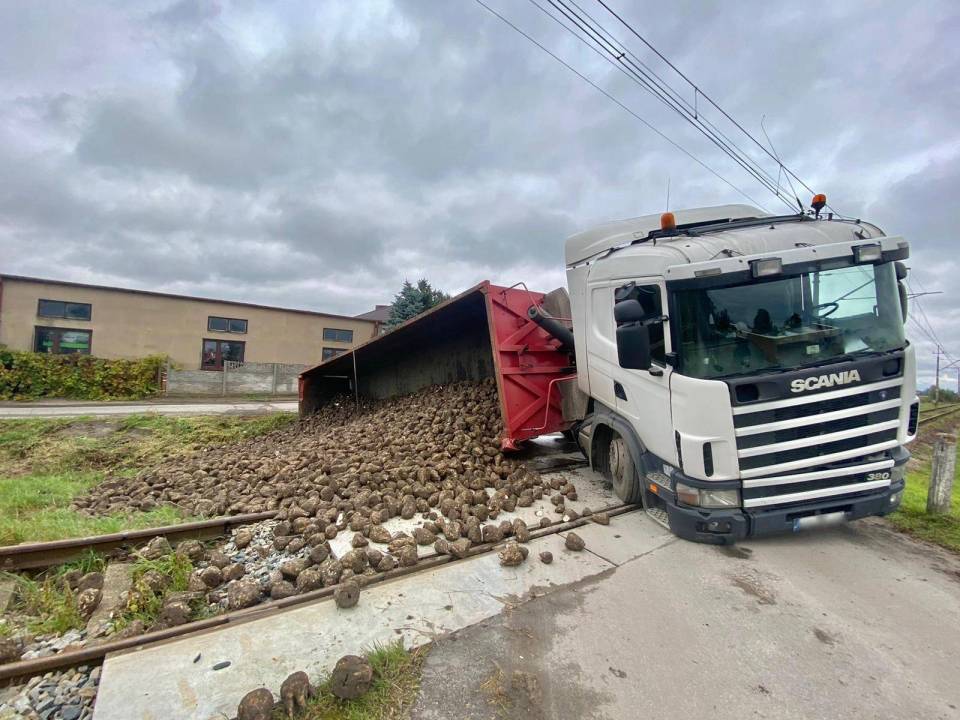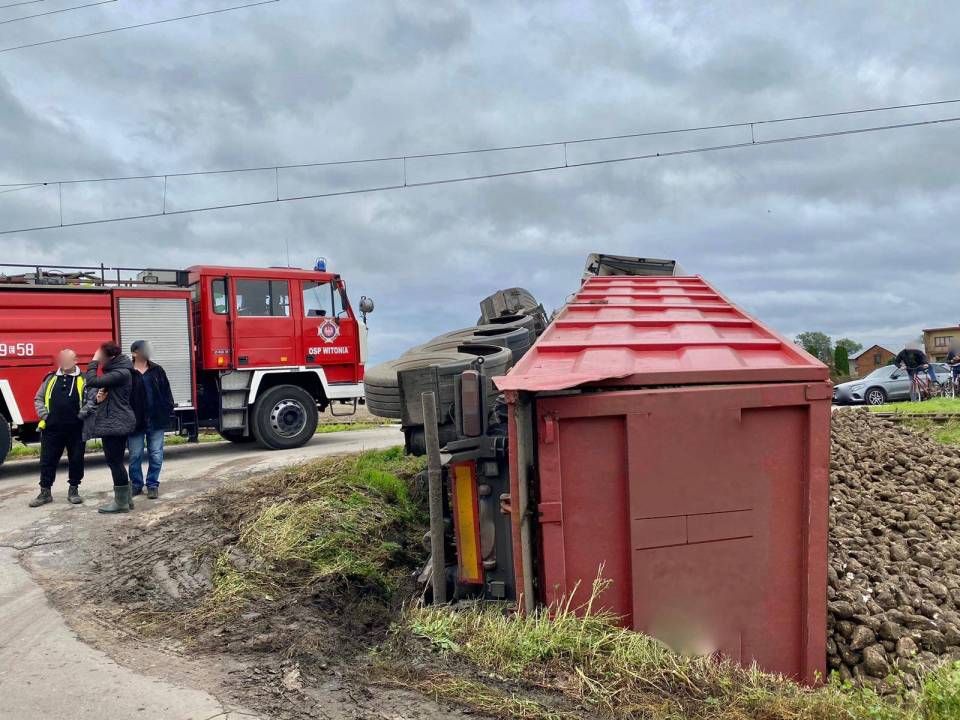 W środę, 14 października kilka minut po godzinie 13:00 do stanowiska kierowania Komendy Powiatowej Państwowej Straży Pożarnej w Łęczycy wpłynęło zgłoszenie o wypadku w Romartowie (gm. Witonia). Na przejeździe kolejowym przewróciła się naczepa ciągnika siodłowego marki Scania, z której następnie wysypały się buraki.