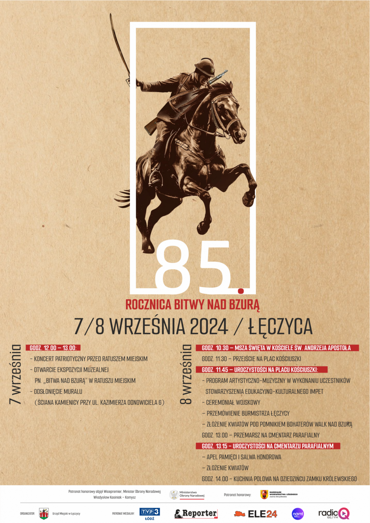 Już w tę niedzielę (8 września) w Łęczycy odbędą się obchody 85. rocznicy Bitwy nad Bzurą. Dzień wcześniej (7 września) otwarta zostanie ekspozycja związana z wydarzeniami z września 1939 roku. Patronat honorowy nad obchodami 85. rocznicy Bitwy nad Bzurą w Łęczycy objęła Marszałek Województwa Łódzkiego Joanna Skrzydlewska.