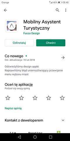 Aby pobrać aplikację na telefon z systemem Android, wystarczy wejść w Sklep Play i w wyszukiwarce wpisać: „Mobilny Asystent Turystyczny". Po kliknięciu w przycisk „Pobierz" aplikacja zostanie ściągnięta na nasz telefon i automatycznie zainstalowana.