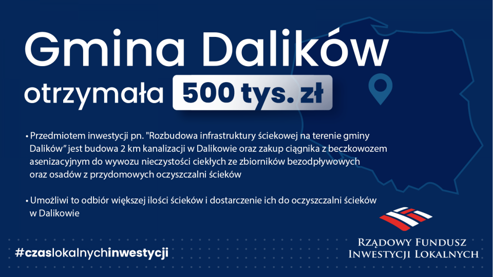 Przedmiotem inwestycji pn. "Rozbudowa infrastruktury ściekowej na terenie gminy Dalików" jest budowa 2 km kanalizacji w Dalikowie oraz zakup ciągnika z beczkowozem asenizacyjnym do wywozu nieczystości ciekłych ze zbiorników bezodpływowych oraz osadów z przydomowych oczyszczalni ścieków. Umożliwi to odbiór większej ilości ścieków i dostarczenie ich do oczyszczalni ścieków w Dalikowie.