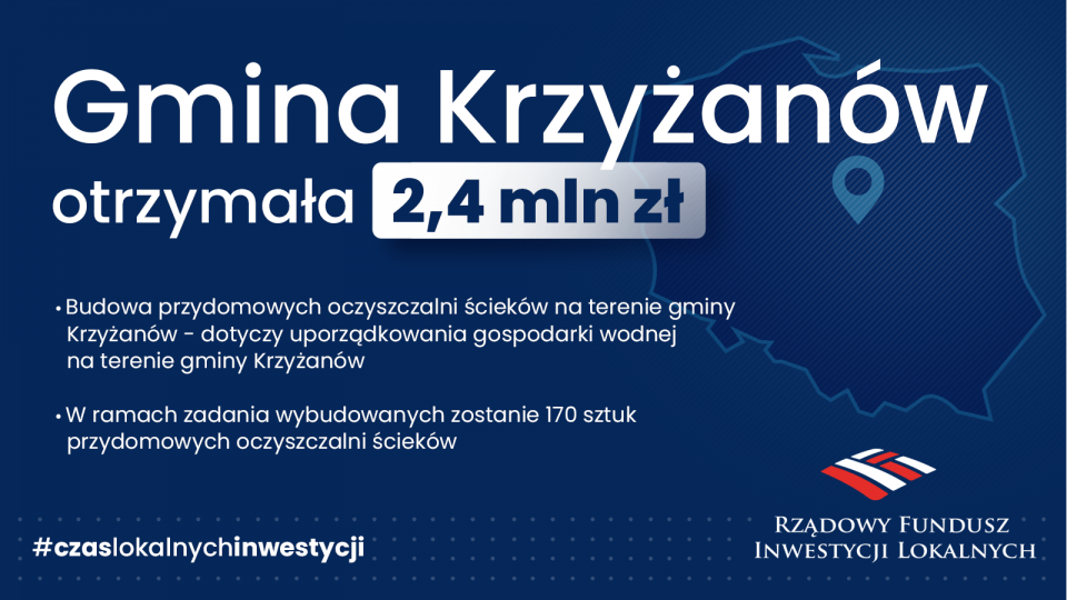 Budowa przydomowych oczyszczalni ścieków na terenie gminy Krzyżanów - dotyczy uporządkowania gospodarki wodnej na terenie gminy Krzyzanów. W ramach zadania wybudowanych zostanie 170 sztuk przydomowych oczyszczalni ścieków
