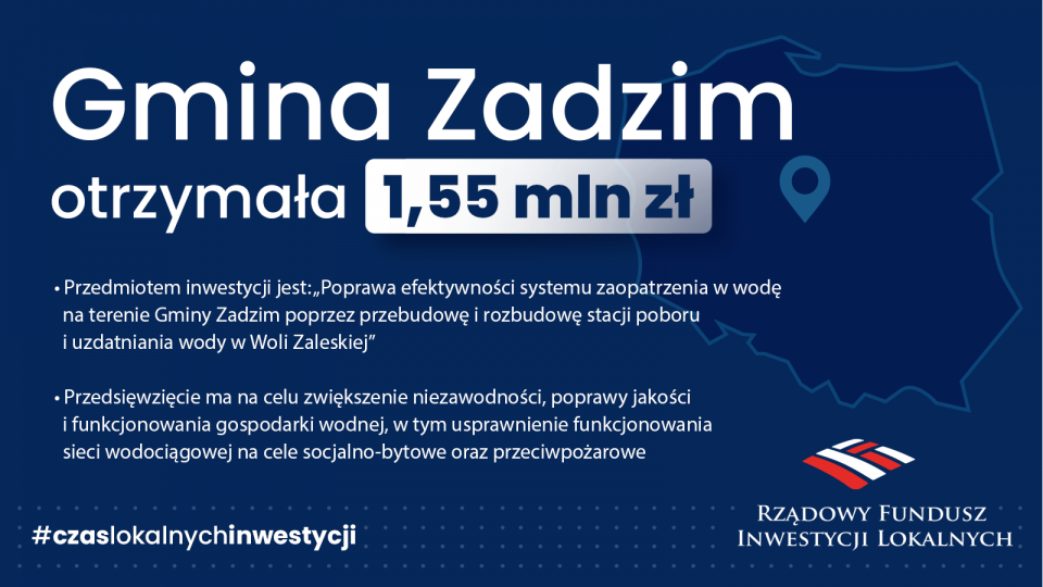 Przedmiotem inwestycji jest: „Poprawa efektywności systemu zaopatrzenia w wodę na terenie Gminy Zadzim poprzez przebudowę i rozbudowę stacji poboru i uzdatniania wody w Woli Zaleskiej". Przedsięwzięcie ma na celu zwiększenie niezawodności, poprawy jakości i funkcjonowania gospodarki wodnej, w tym usprawnienie funkcjonowania sieci wodociągowej na cele socjalno-bytowe oraz przeciwpożarowe. Zakres zadania obejmuje: