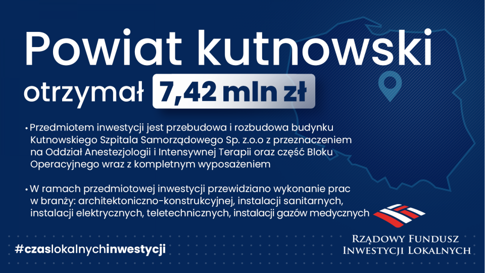 - Cieszę się, że kolejne środki trafią z funduszu inwestycji lokalnych. Bardzo zależało nam na wsparciu kutnowskiego szpitala i przebudowie OIOM-u w Kutnie. Bez dofinansowania, sytuacja szpitala była tragiczna, pojawiały się już wyroki sądowe względem tej placówki, która nie mogła poprawnie funkcjonować - mówi Senator RP, Przemysław Błaszczyk. - Dziękuję za wsparcie Pani Poseł Joannie Lichockiej - dodaje Błaszczyk.