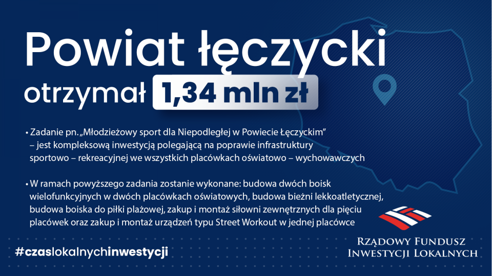 Zadanie pn. „Młodzieżowy sport dla Niepodległej w Powiecie Łęczyckim" – jest kompleksową inwestycją polegającą na poprawie infrastruktury sportowo – rekreacyjnej we wszystkich placówkach oświatowo – wychowawczych Powiatu Łęczyckiego. W ramach powyższego zadania zostanie wykonane: budowa dwóch boisk wielofunkcyjnych w dwóch placówkach oświatowych, budowa bieżni lekkoatletycznej, budowa boiska do piłki plażowej, zakup i montaż siłowni zewnętrznych dla pięciu placówek oraz zakup i montaż urządzeń typu Street Workout w jednej placówce.