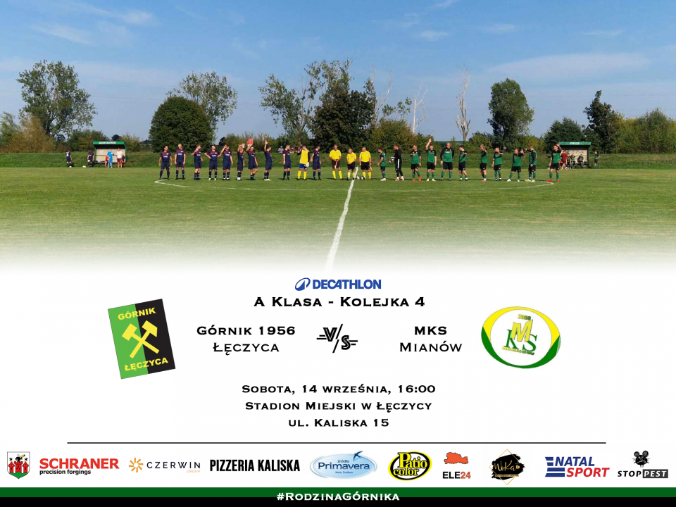 Sobota, 14 września, 16:00 - Górnik 1956 Łęczyca - MKS Mianów (A Klasa, grupa I)
