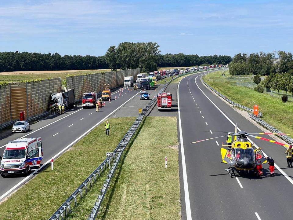 Aktualizacja: Kierujący samochodem ciężarowym został przetransportowany do szpitala przez Lotnicze Pogotowie Ratunkowe. Droga w kierunku Gdańska jest już przejezdna. W kierunku Łodzi do dyspozycji kierowców jest aktualnie jeden pas.