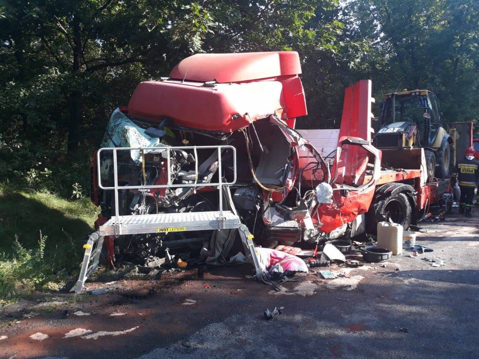 Jak relacjonują strażacy, na drodze krajowej nr 71, na wysokości skrętu do Łagiewnik, doszło do czołowego zderzenia busa dostawczego i ciężarówki z lawetą. W wyniku zdarzenia ranne zostały trzy osoby, z których dwie byłī zakleszczone w rozbitym pojeździe.