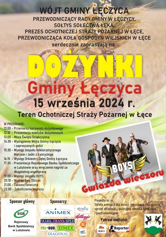 W niedzielę (15 września) odbędą się tegoroczne Dożynki Gminy Łęczyca. Wydarzenie będzie miało miejsce na terenie Ochotniczej Straży Pożarnej w Łęce.
