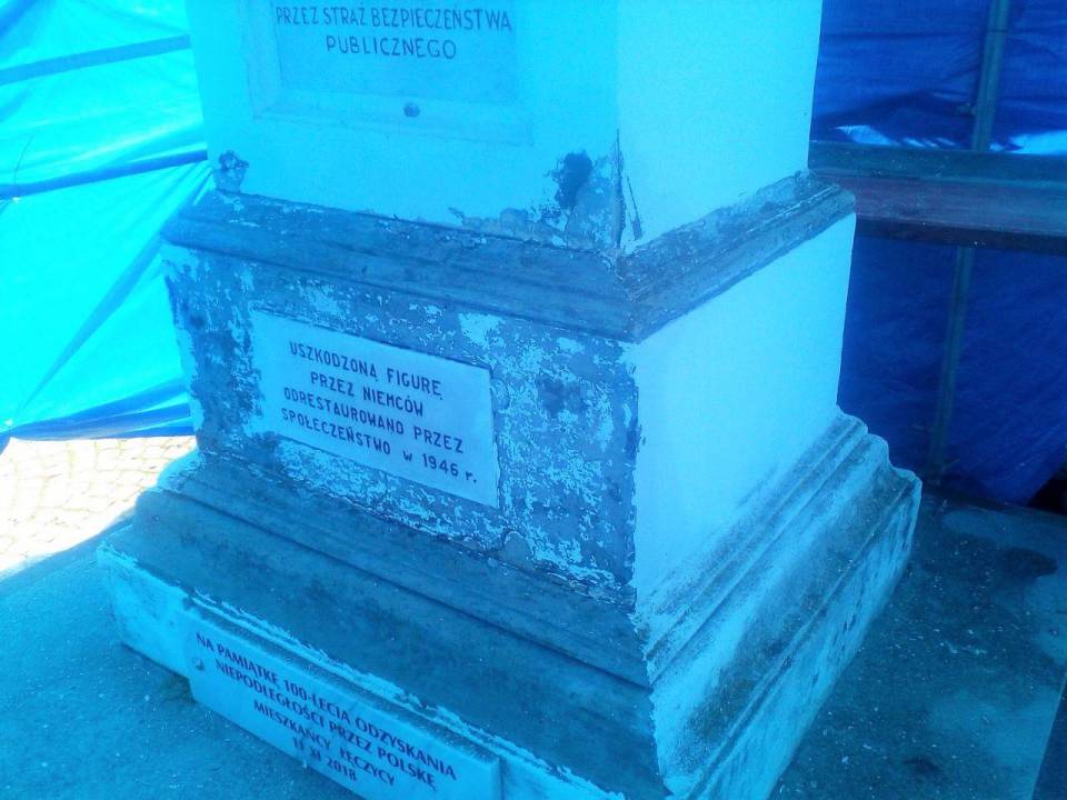 W pomnik wmurowane są trzy płyty – pierwsza sięga lat dwudziestych XX i poświęcona jest rozbrojeniu Niemców 11 listopada 1918 roku, druga informuje o odnowieniu przez łęczycan w 1946 roku figury uszkodzonej przez Niemców, a trzecia wmurowana została na pamiątkę 100-lecia odzyskania przez Polskę niepodległości.