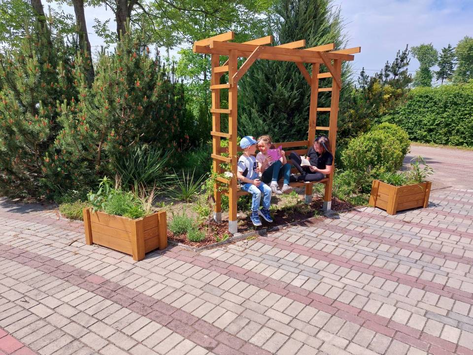 Oprócz regału na książki, na terenie zamontowano drewniane pergole z siedziskami, ławki, stoliki, drewniane donice i posadzono mnóstwo kwiatów. Wszystko po to, aby czytelnicy mogli w komfortowych i przyjemnych warunkach oddawać się czytaniu książek na świeżym powietrzu.
