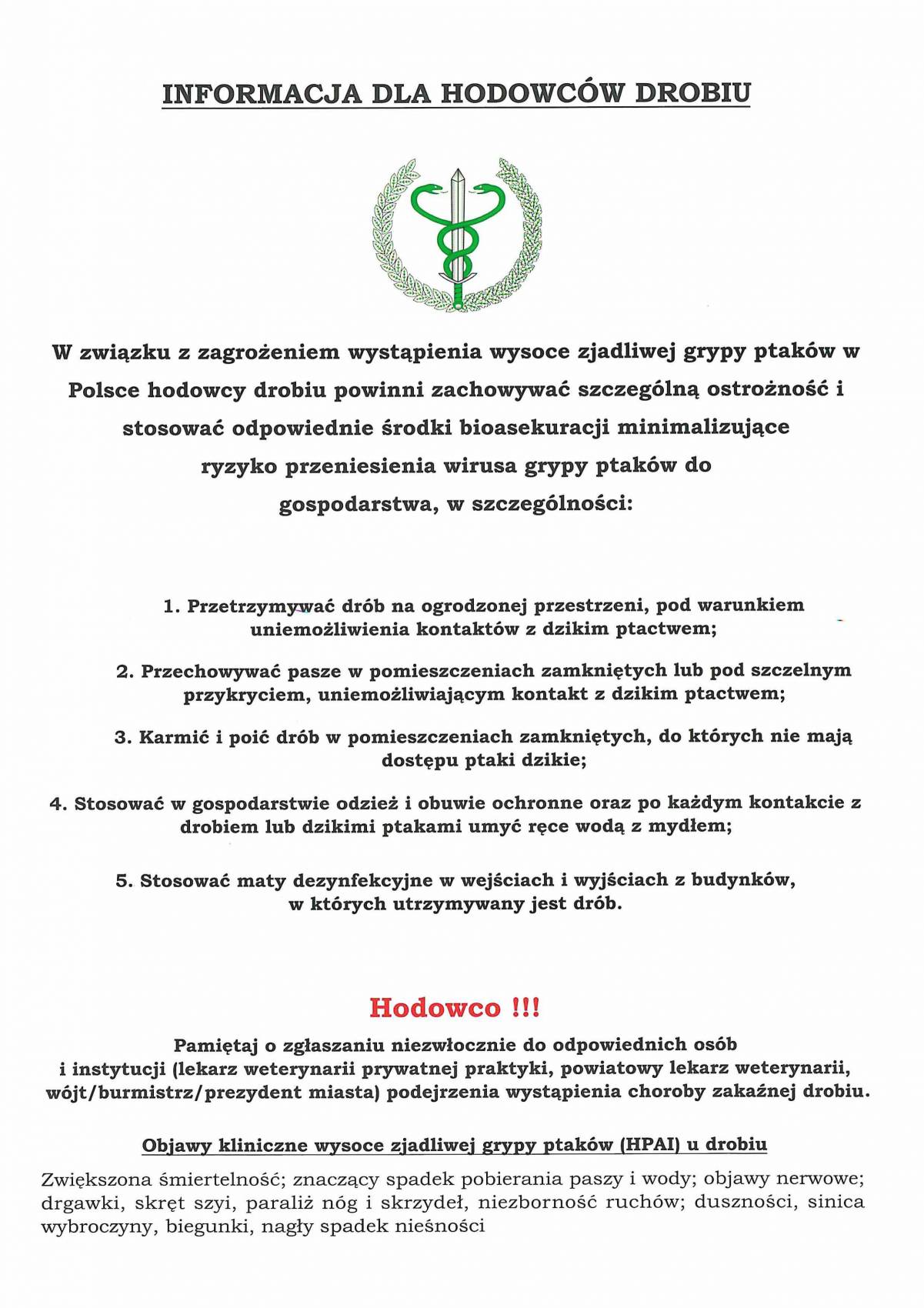 W przypadku podejrzenia zachorowania na ptasią grypę należy natychmiast powiadomić Powiatowy Inspektorat Weterynarii lub lekarza weterynarii opiekującego się stadem.