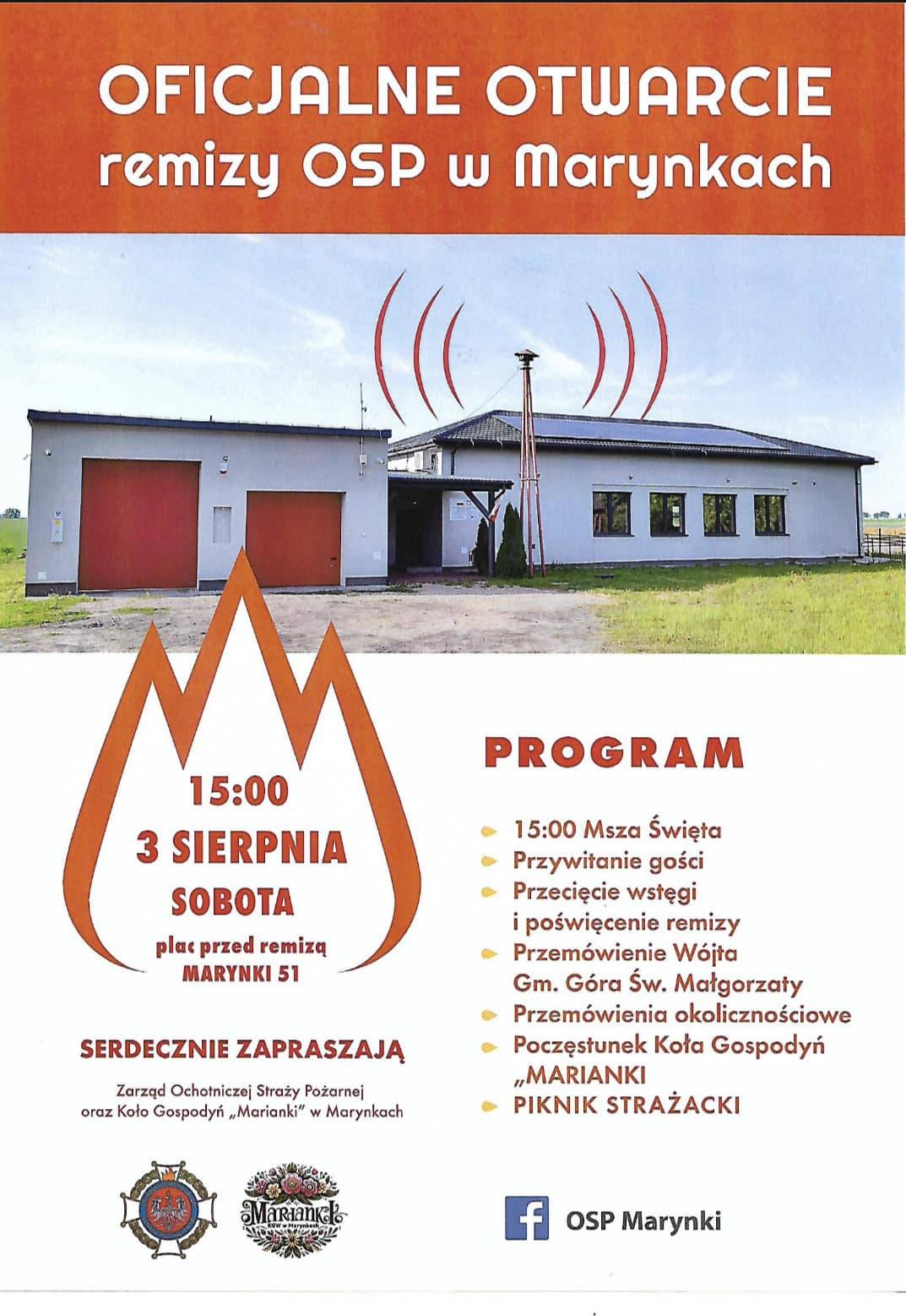 W programie zaplanowano Mszę Świętą, przywitanie gości, przecięcie wstęgi i poświęcenie remizy, przemówienie Wójta Gminy Góra Św. Małgorzaty, przemówienia okolicznościowe, poczęstunek KG "Marianki" oraz piknik strażacki.