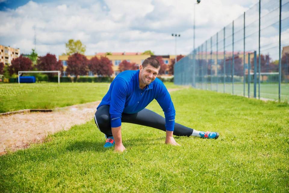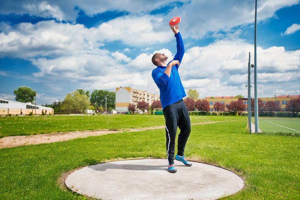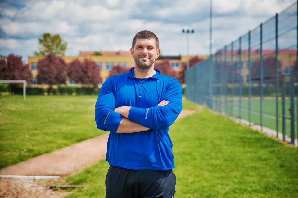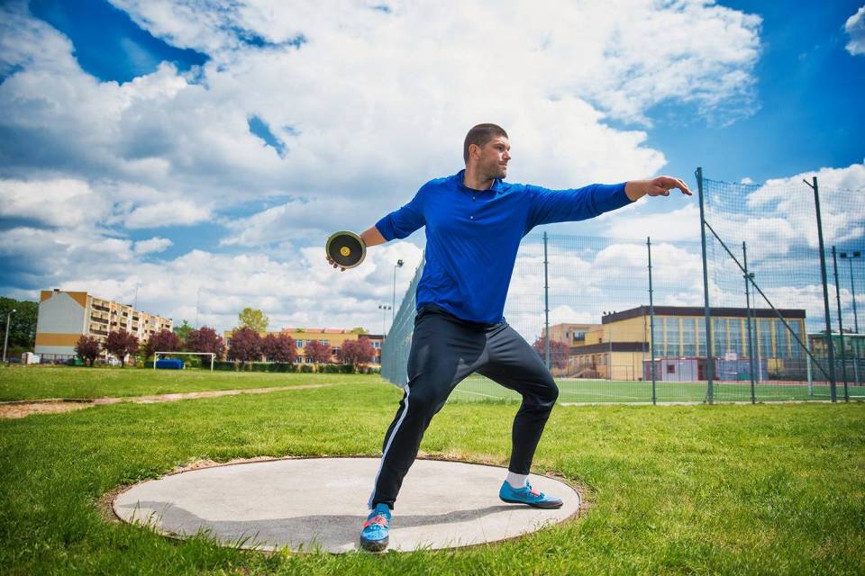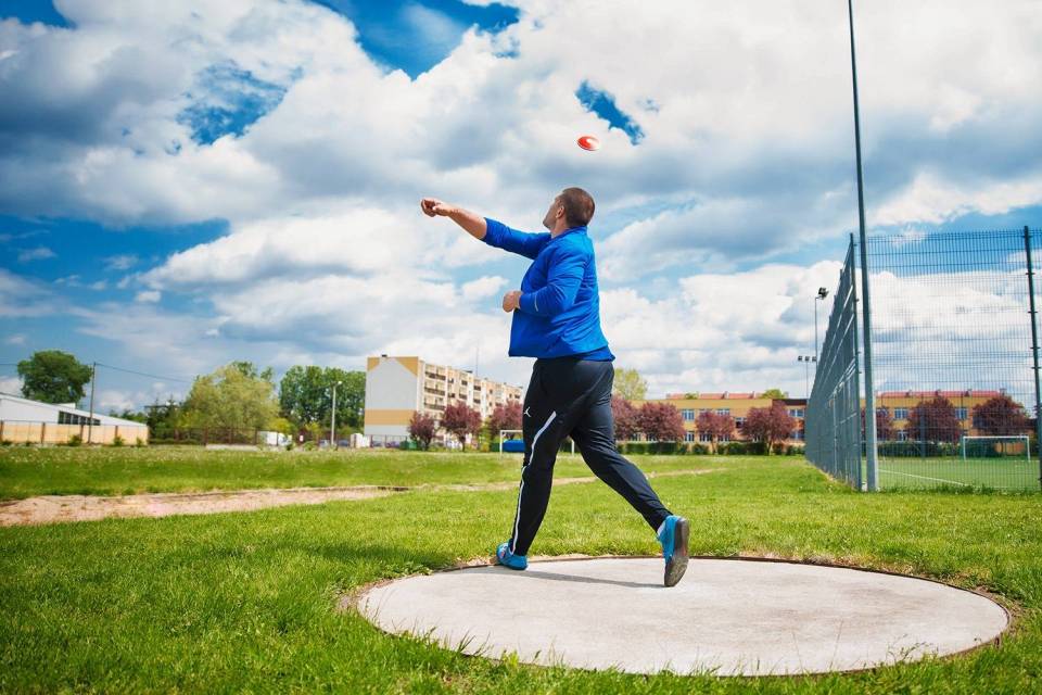 Łęczycki dyskobol trenuje na boisku przy Szkole Podstawowej nr 4, aby utrzymać dobrą formę do czasu, kiedy zakończy się epidemia koronawirusa.