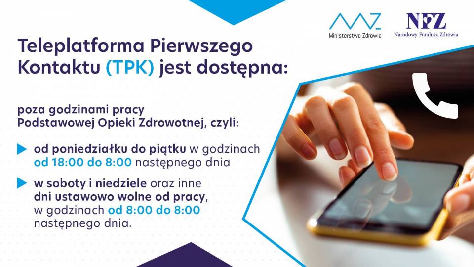 Narodowy Funduszu Zdrowia uruchomił nową usługę w ramach nocnej i świątecznej opieki medycznej. Aby skorzystać z pomocy lekarza lub pielęgniarki nie będzie już konieczności wizyty w ośrodku zdrowia, wystarczy telefon pod bezpłatny numer: 800 137 200. W ramachTeleplatformy Pierwszego Kontaktu (TPK) można uzyskać porady, e-receptę, e-skierowanie lub e-zwolnienie. Warto dodać, że połączenia telefoniczne są obsługiwane w czterech językach: polskim, angielskim, rosyjskim i ukraińskim. Z kolei osoby niesłyszące mogą skorzystać z wideoczatu na stronie NFZ.