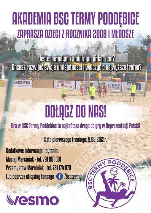 - Jesteś młodym i ambitnym piłkarzem? Urodziłeś się w roku 2008, a może jesteś młodszy? Chcesz rozwijać swoje umiejętności w piłce nożnej plażowej? Chcesz walczyć o najwyższe trofea, a przy tym spędzać czas w super atmosferze? Teraz, to wszystko możliwe dołączając do Akademii BSC Termy Poddębice! - zachęcają przedstawiciele klubu. - Drogi rodzicu do dzieła! Wystarczy, że się z nami skontaktujesz Gra w BSC Termy Poddębice to najkrótsza droga do reprezentacji Polski Zapraszamy!