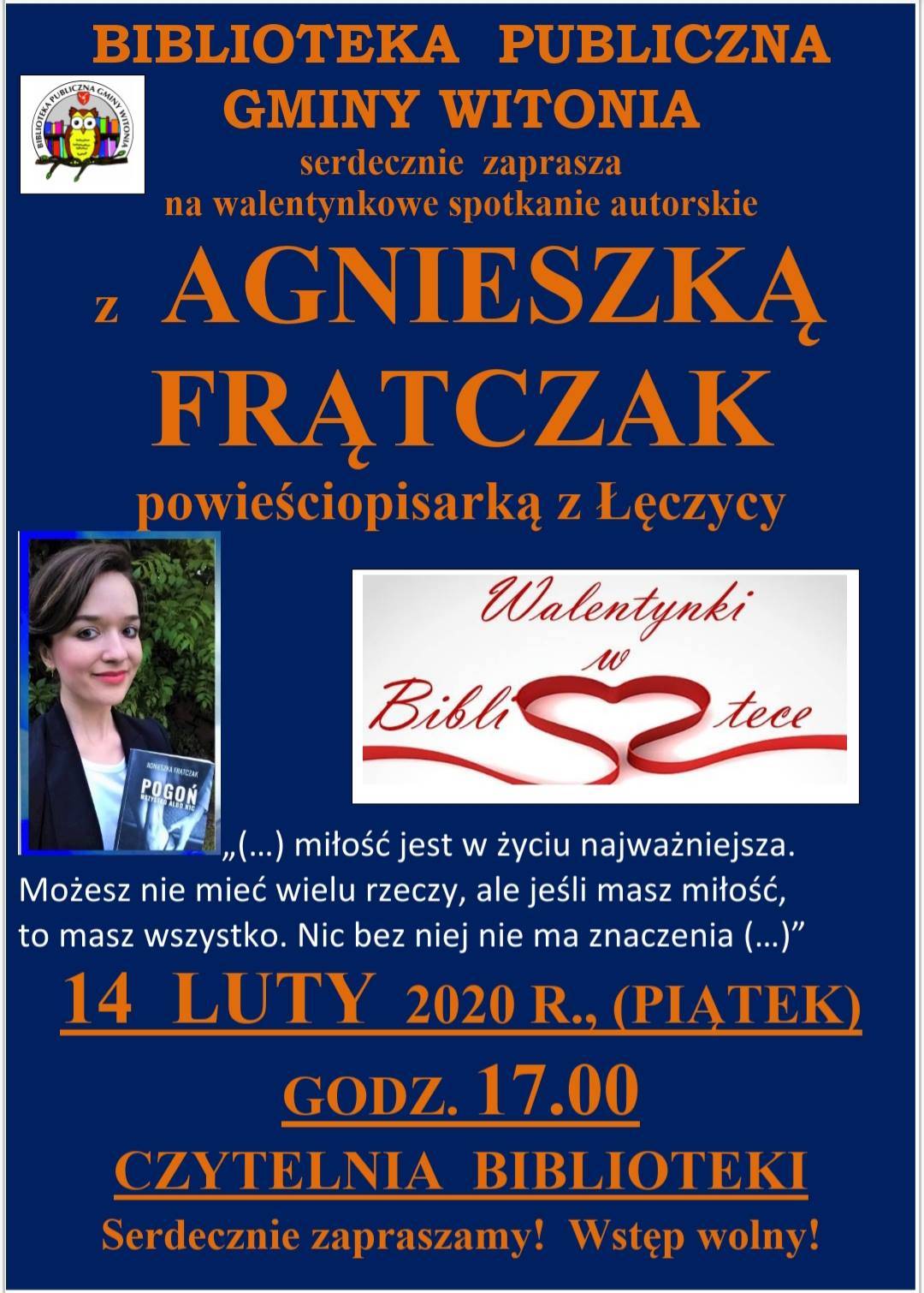 Biblioteka Publiczna Gminy Witonia serdecznie zaprasza na walentynkowe spotkanie autorskie z Agnieszką Frątczak, powieściopisarką z Łęczycy.