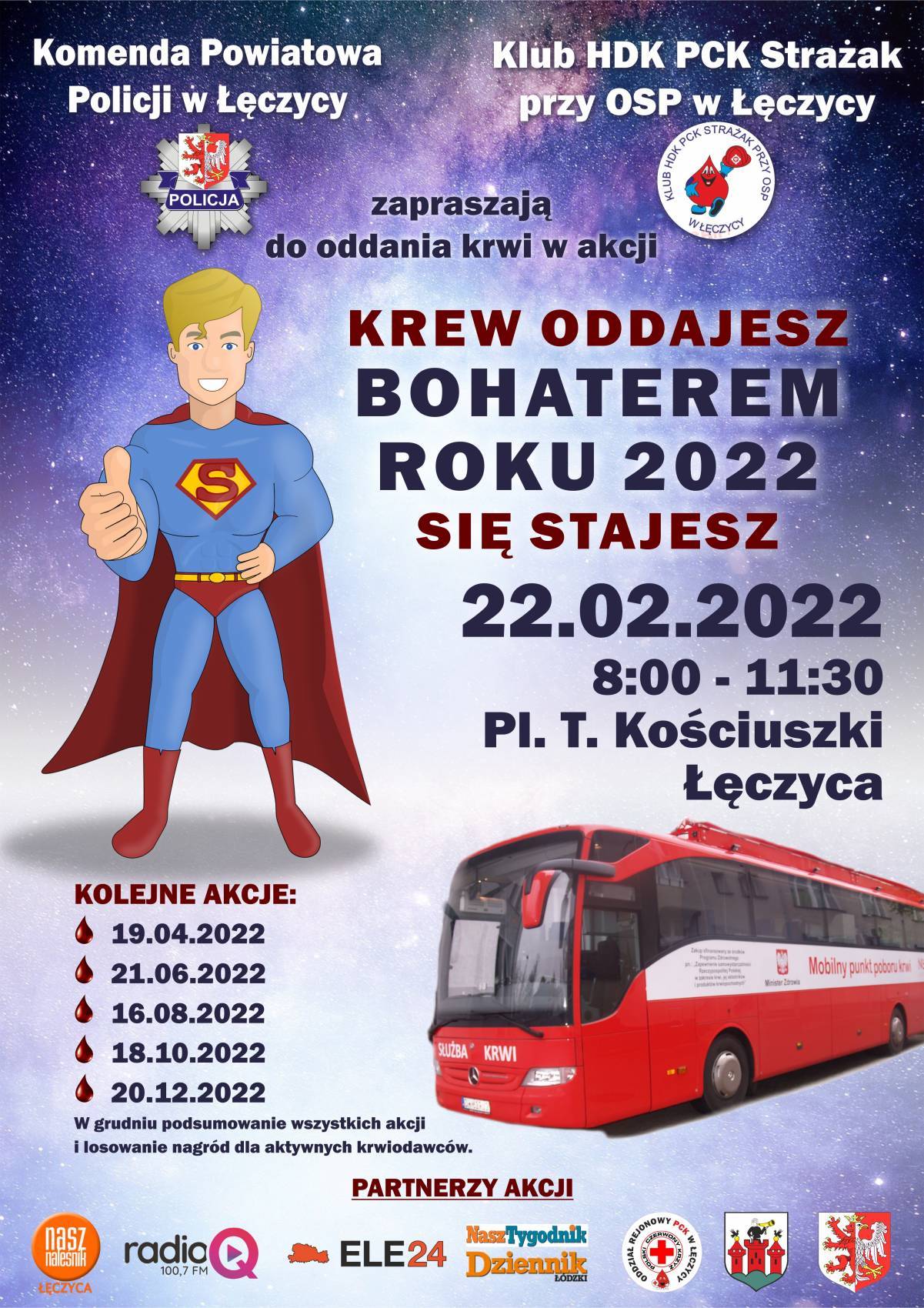 Komenda Powiatowa Policji w Łęczycy oraz Klub HDK PCK Strażak przy OSP w Łęczycy zapraszają do oddawania krwi w akcji "Krew oddajesz, bohaterem roku 2022 się stajesz".