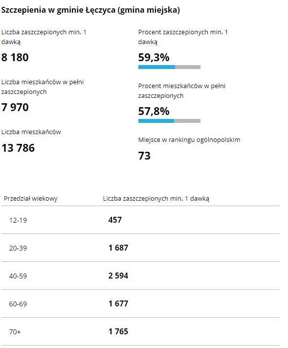 Ze statystyk Ministerstwa Zdrowia wynika, że na liczbę mieszkańców – 13 786 – w pełni zaszczepionych zostało 7 970. Daje to 57,8%. Zaszczepionych min. 1 dawką jest 8 180 mieszkańców (59,3%). Taki poziom sczepień powoduje, że Łęczyca zajmuje 73. pozycję w rankingu ogólnopolskim na 2477 możliwych pozycji.