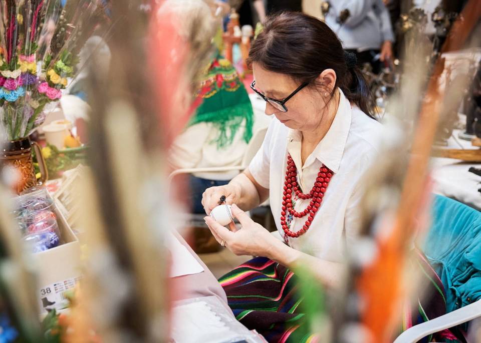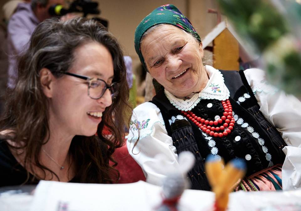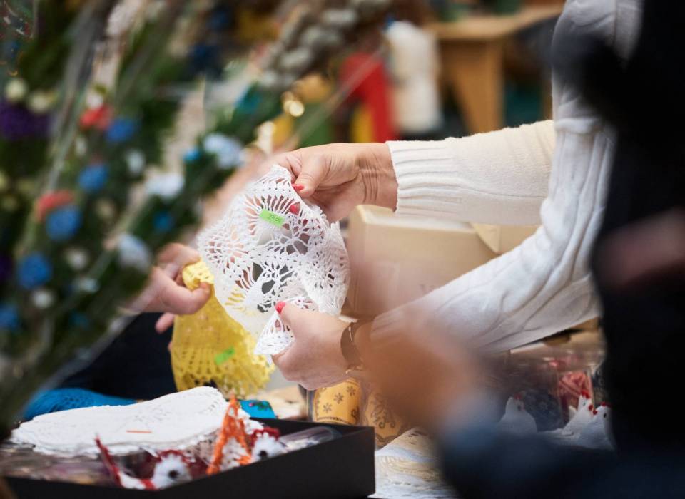 Wielkanocny kiermasz ŁDK to nie tylko okazja, żeby kupić unikatowe pisanki opoczyńskie czy drewniane figurki z regionu kutnowskiego - a zarówno folklor opoczyński, jak i rzeźba kutnowska są wpisane na listę niematerialnego dziedzictwa UNESCO - ale też podejrzeć warsztat twórców i porozmawiać z nimi o ich pracy. Tegoroczny kiermasz odwiedziła m.in. Joanna Skrzydlewska, marszałek województwa, która pod okiem twórczyń uczyła się robić bibułkowe różyczki zdobiące opoczyńskie palmy wielkanocne.