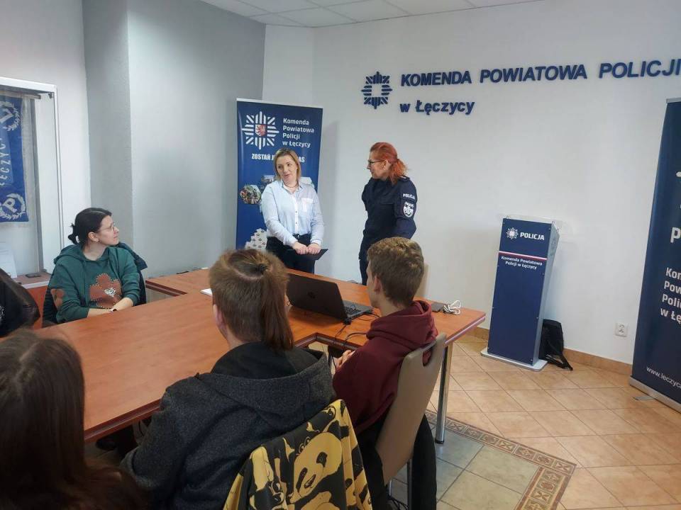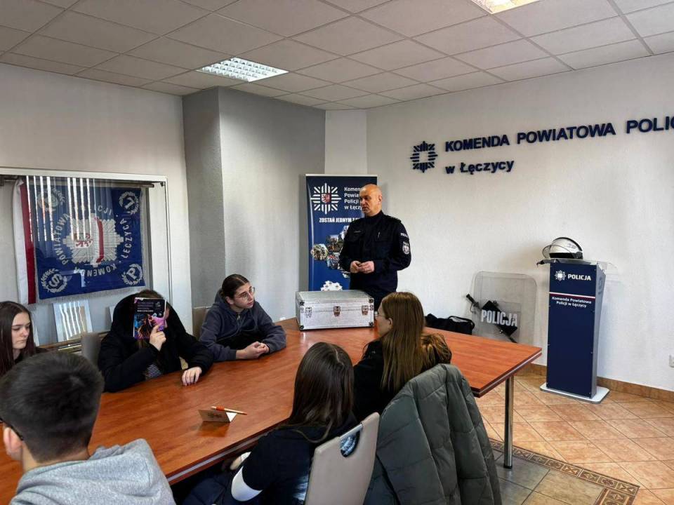 W sali odpraw łęczyckiej komendy odbyła się lekcja z doradztwa zawodowego skierowana do uczniów klas 8 z "podstawówki" w Górze Świętej Małgorzaty. Dzień później jej odbiorcami byli uczniowie Zespołu Szkół Ponadpodstawowych imienia Kardynała Wyszyńskiego w Łęczycy.
