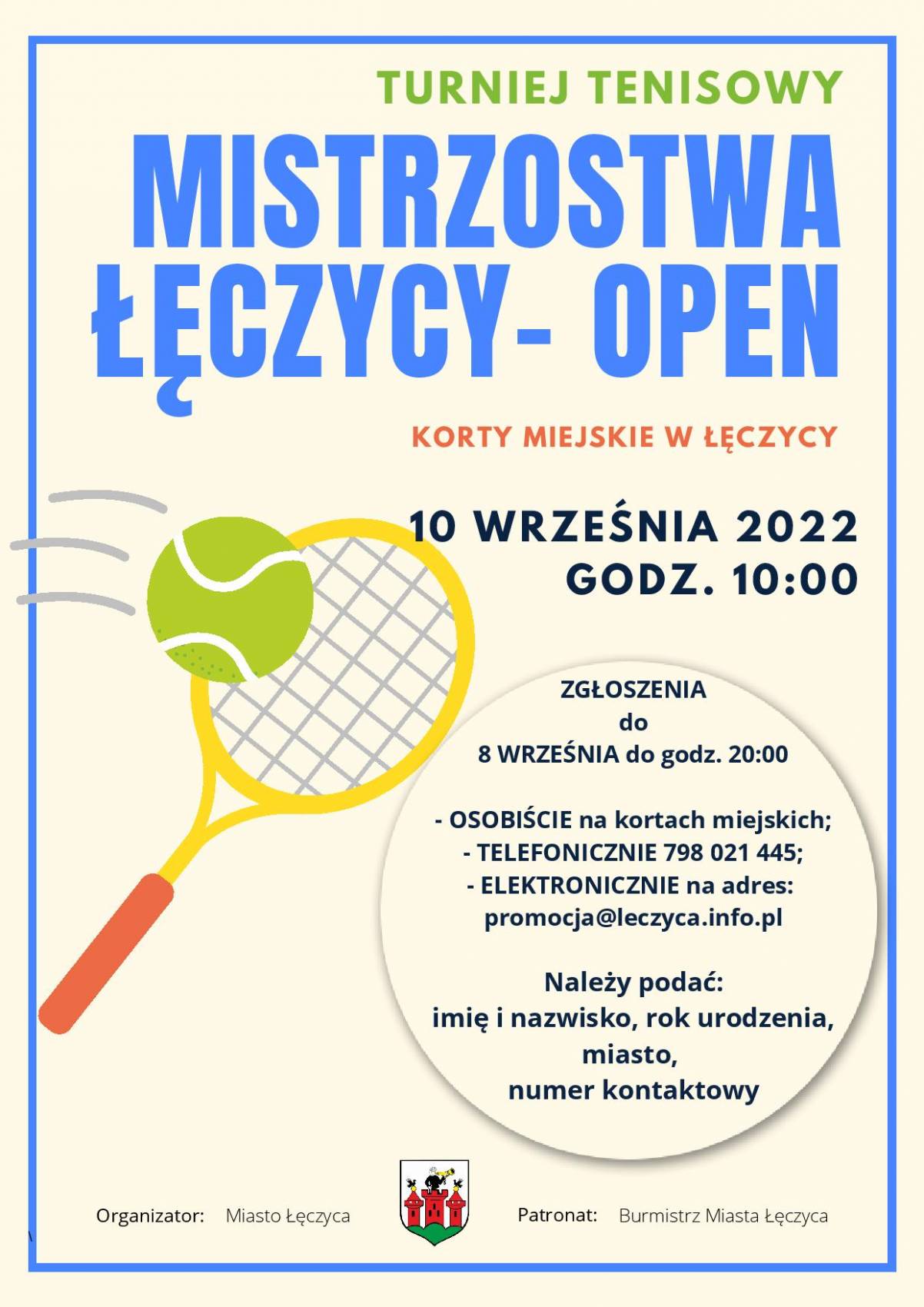 Zgłoszeń do udziału w rozgrywkach można dokonywać osobiście na kortach miejskich, telefonicznie – 798 021 445 – lub mailowo: Ten adres pocztowy jest chroniony przed spamowaniem. Aby go zobaczyć, konieczne jest włączenie w przeglądarce obsługi JavaScript.. W zgłoszeniu należy podać imię, nazwisko, rok urodzenia, miasto oraz numer kontaktowy.