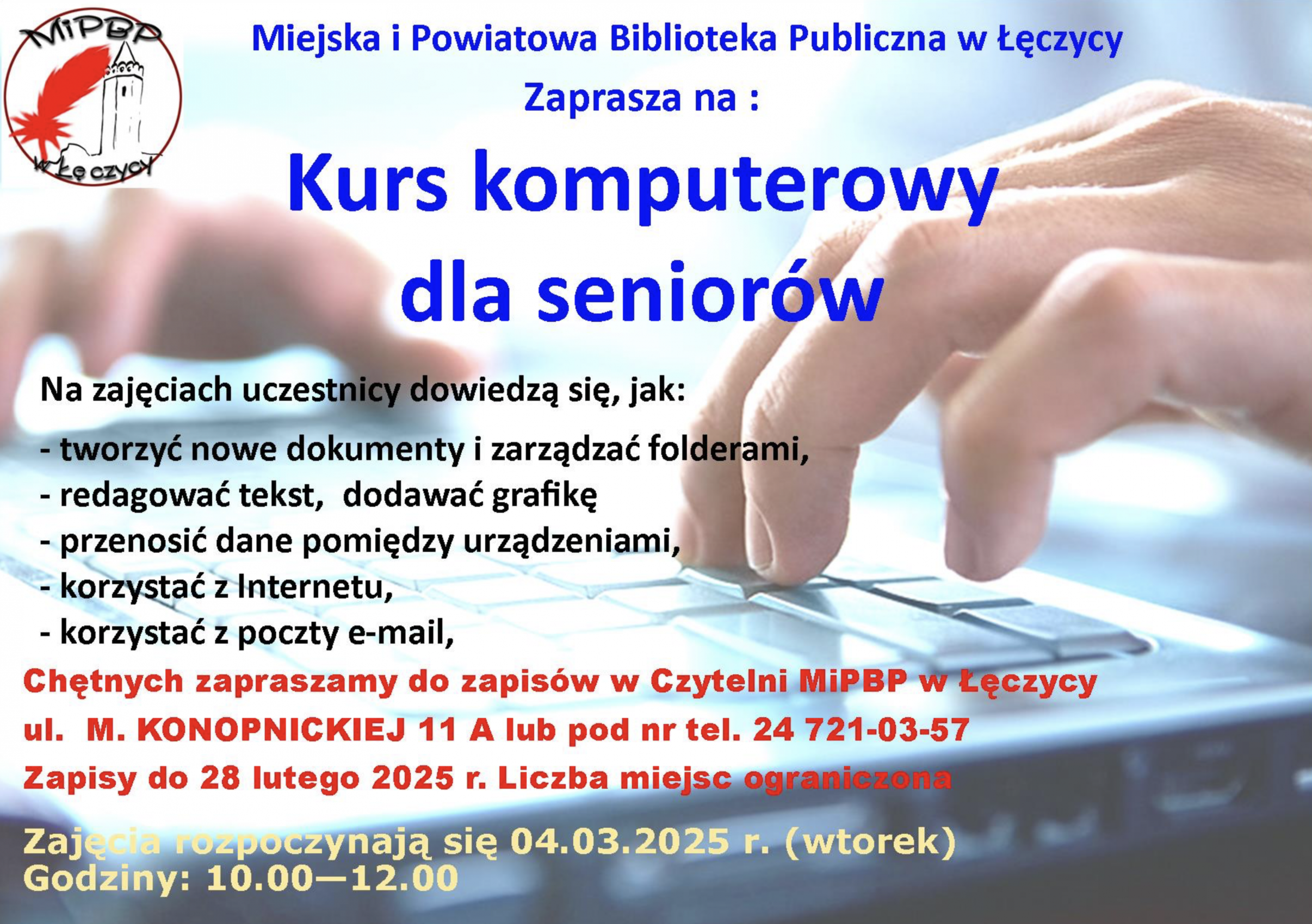 Miejska i Powiatowa Biblioteka Publiczna w Łęczycy zaprasza na kurs komputerowy dla seniorów.