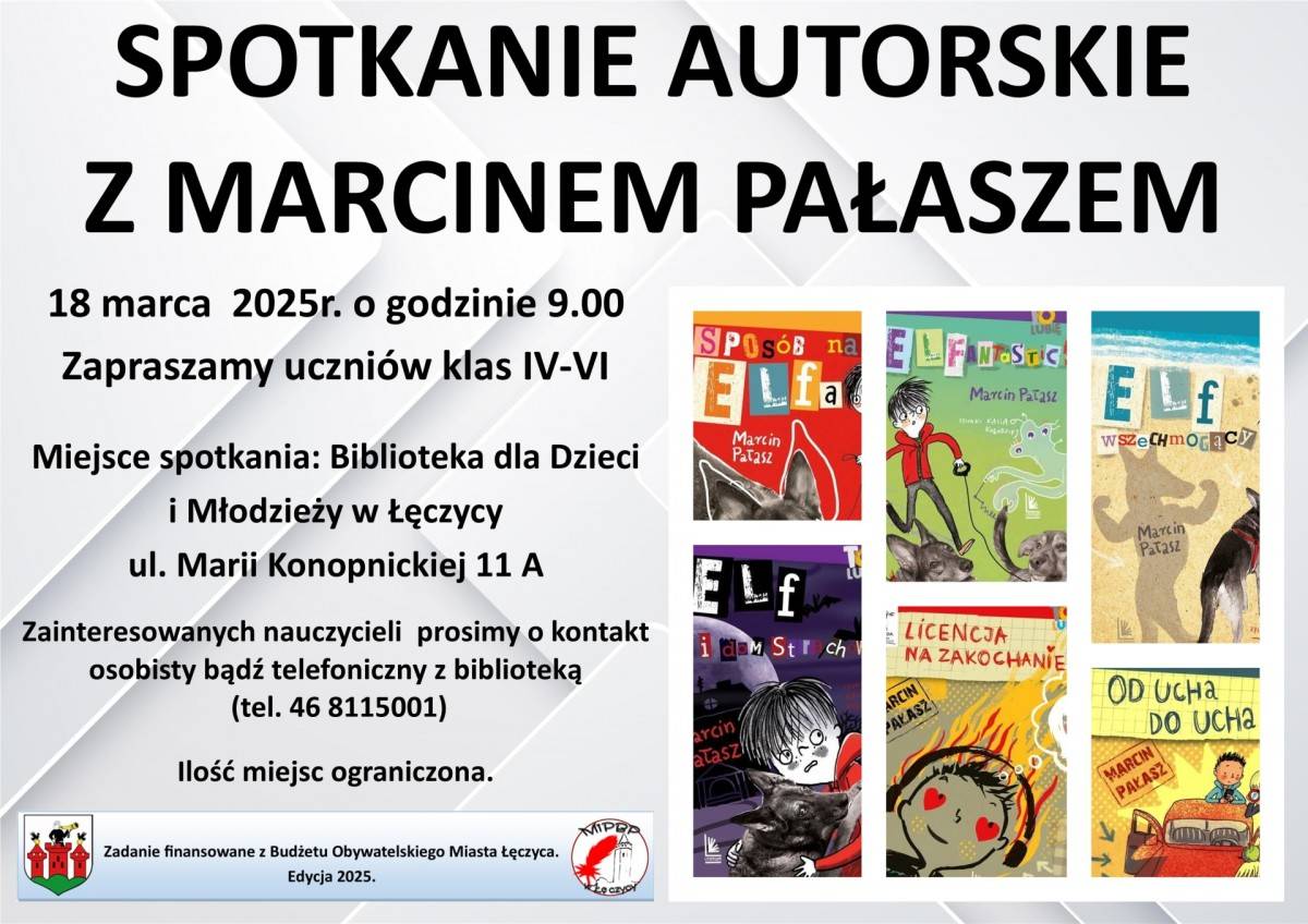 Biblioteka dla Dzieci i Młodzieży w Łęczycy zaprasza uczniów klas IV-VI szkół podstawowych z Łęczycy i powiatu łęczyckiego wraz z nauczycielami na spotkanie autorskie z Marcinem Pałaszem. Spotkanie odbędzie się 18 marca 2025 roku o godz. 9.00.
