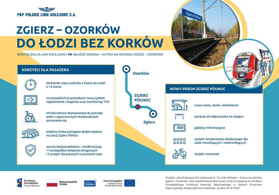 Projekt pn. „Rewitalizacja linii kolejowej nr 16 Łódź Widzew – Kutno na odcinku Zgierz – Ozorków" o wartości 172,8 mln netto jest dofinansowany ze środków Regionalnego Programu Operacyjnego Województwa Łódzkiego na lata 2014-2020 w kwocie 143,3 mln zł.